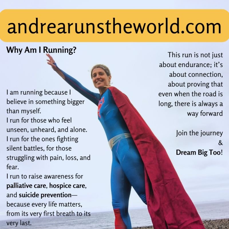 “At 43, I’m embarking on my most ambitious journey yet—running around the world for causes that matter deeply to me: palliative care, hospice care, and suicide prevention. Running is my passion, a force that inspires and connects people. Through this journey, I hope to share its transformative power every step of the way. Join me and dream big too—let’s make a difference together.”